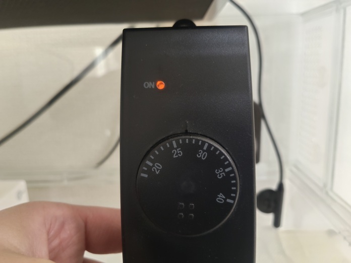 イージーグローサーモの温度設定は、ダイヤルを回すだけの簡単調整です。今回は27度に設定しました。左上のONが点灯している時は、ヒーターに通電している状態です。この状態でしばらく放置してみます。