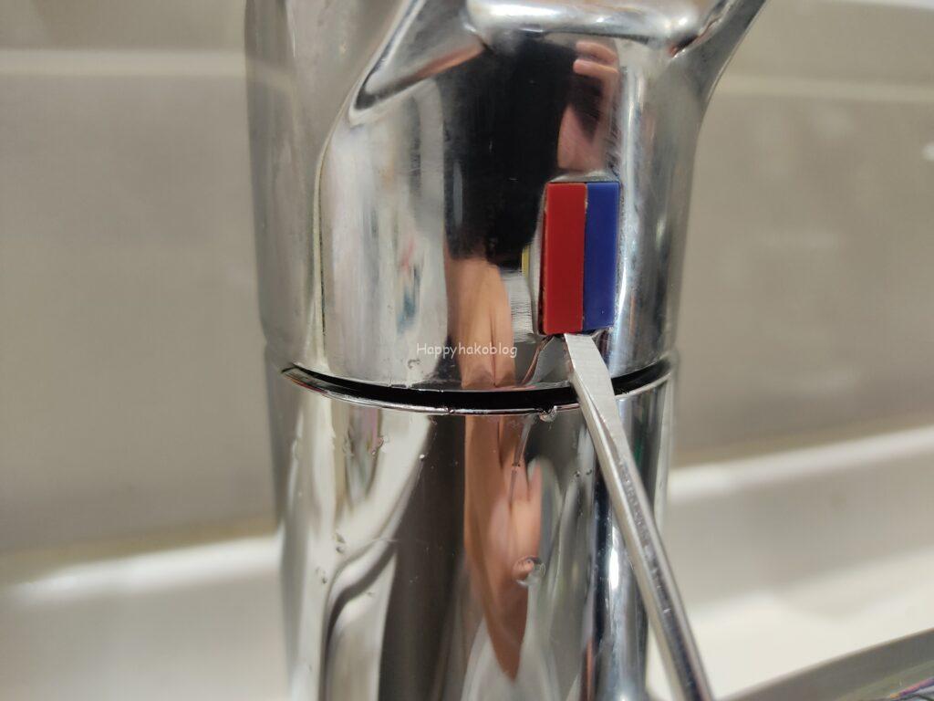 マイナスドライバーなどを赤青の湯水表示の下側に差し込んで、手前に引き出して取り外す。