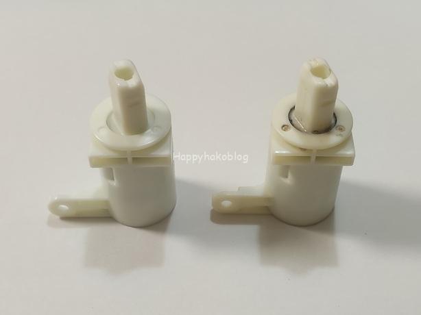 新旧を並べて見比べてみると、状態の違いが一目で分かります。左側が新品の状態、右側が長期間使用していた古いものです。右側を見ると、経年劣化が進んでいるのがはっきり分かります。表面のくすみだけでなく、内部からオイルが滲み出ており、ダンパーが機能していないのも納得です。